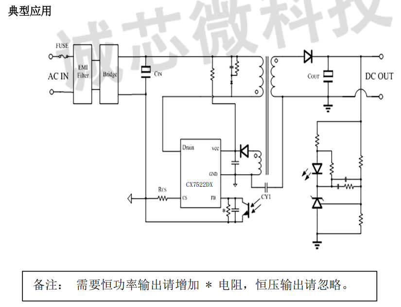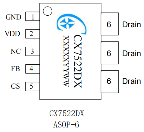 CX7522DX是一颗电流模式 PWM 控制芯片,内置高压功率 MOSFET,应用于功率在27W以下的方案。在 PWM 模式下工作于固定开关频率,这个频率是由内部精确设定。在空载或者轻载时,工作频率由IC内部调整。芯片可以工作在绿色模式,以此来减小轻载时的损耗,提高整机的 工作效率。在启动和工作时只需要很小的电流,可以在启动电路中使用一个很大的电阻,以此来进一步减小待机时的功耗。芯片内置有斜坡补偿电路,当电路工作于大占空比时,避免次谐波振荡的发生,改善系统的稳定性。内置有前沿消隐时(Leading-edge blanking time),消除缓冲网络中的二极管反向恢复电流对电路的影响。采用了抖频技术,能够有效改善系统的 EMI 性能。系统的跳频频率设置在音频(22KHz)以上,在工作时可以避免系统产生噪音。内置多种保护,包括逐周期限流保护(OCP),过压保护(VDD OVP),VDD 过压箝位,欠压保护(UVLO),过温保护(OTP)等,通过内部的软驱动结构可以更好的改善系统的 EMI 特性。