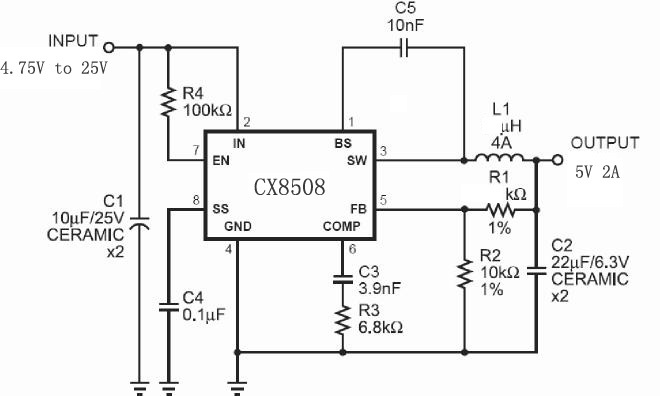 CX8508 是一款单芯片同步降压稳压器,内置MOS,在输入电压4.75v-25v范围,最大可达到1.8A电流,采用的电流控制模式有快的瞬间响应和不间断的过流检测,具有软启动过温保护,在待机模式下电流仅为1 μA,