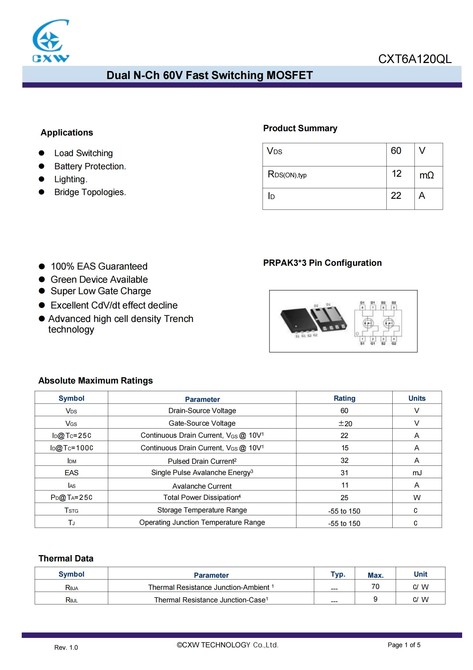 CXT6A120QL:双N管/60V /22A 12mΩ  采用DFN3.3*3.3封装