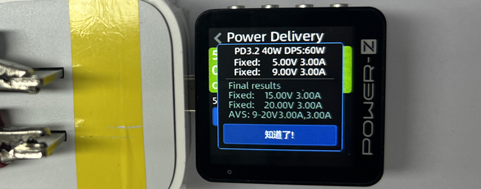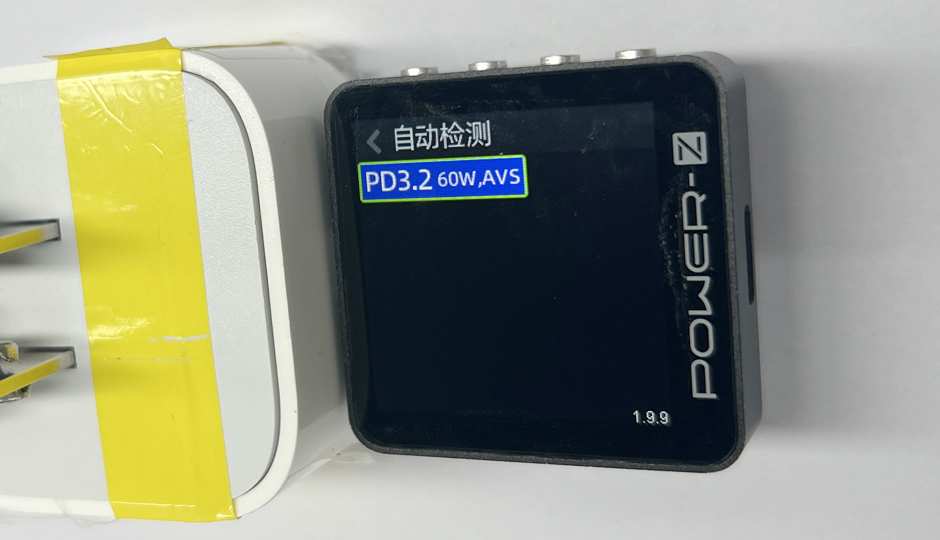 给模块通电,使用ChargerLAB POWER-Z KM003C测得USB-C口支持PD3.2、AVS、DPS充电协议。